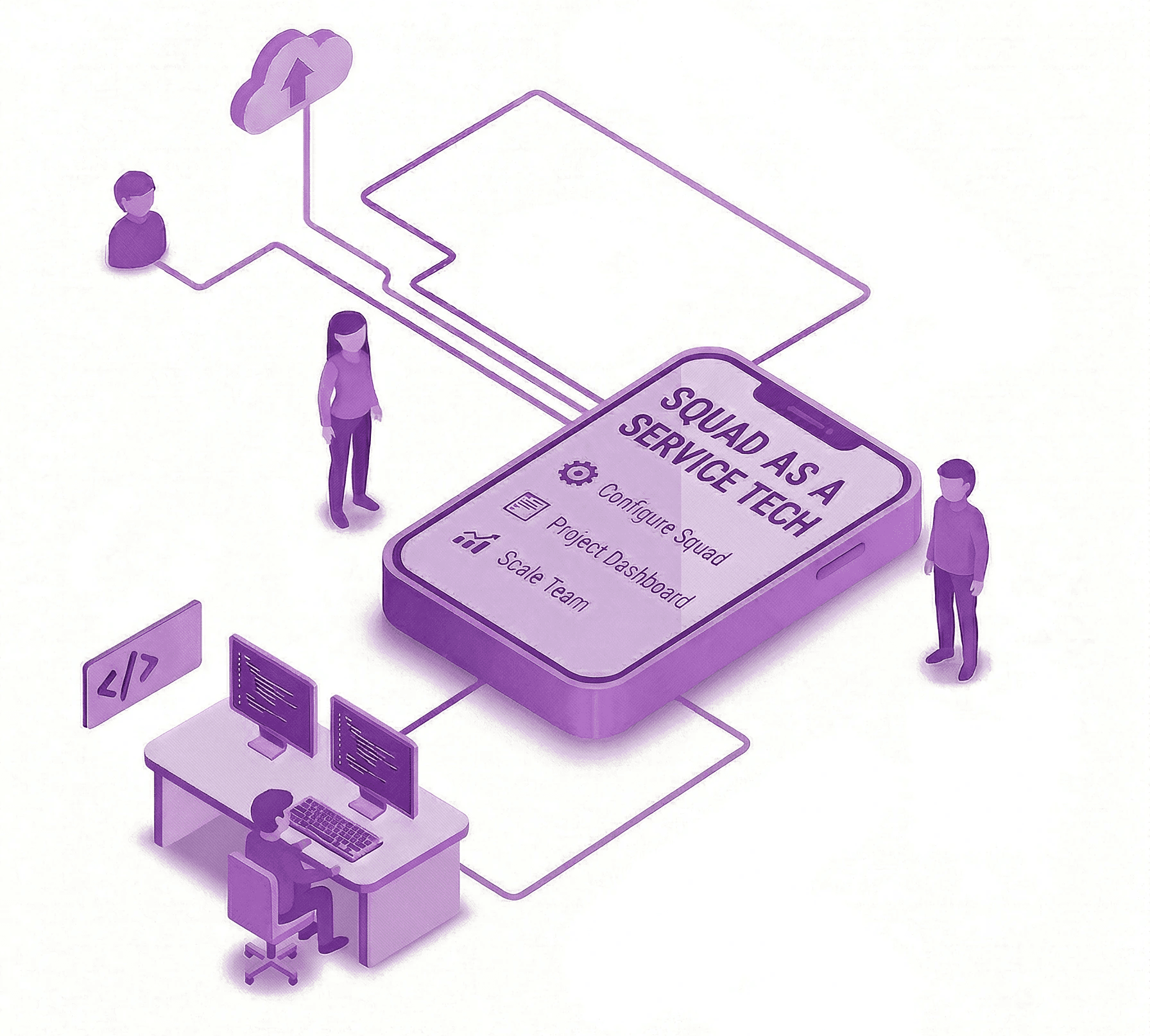 Um Squad de Desenvolvimento é um time completo de tecnologia dedicado a construir, evoluir e manter sistemas e plataformas digitais da sua empresa.